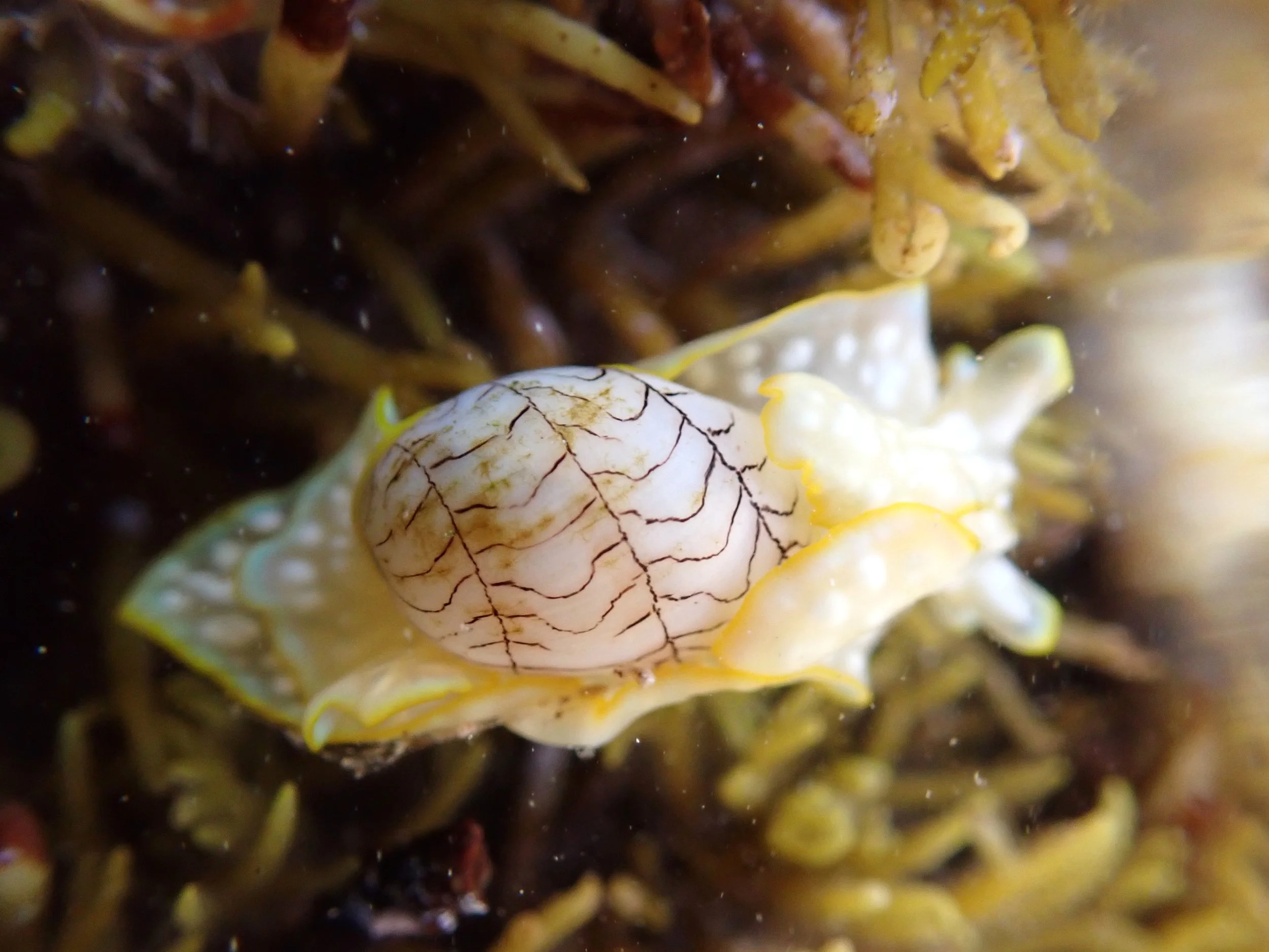 Among the more eye‑catching finds is the colourful bubble snail Micromelo undatus (pictured), which hunts cirratulid worms and stores their toxins as a defence against predators (making it an unpalatable toxic meal!). In return, the seaweed and seagrass provide the shelter and structure that grazers, predators and many other invertebrates need, sustaining the reef’s rich biodiversity.