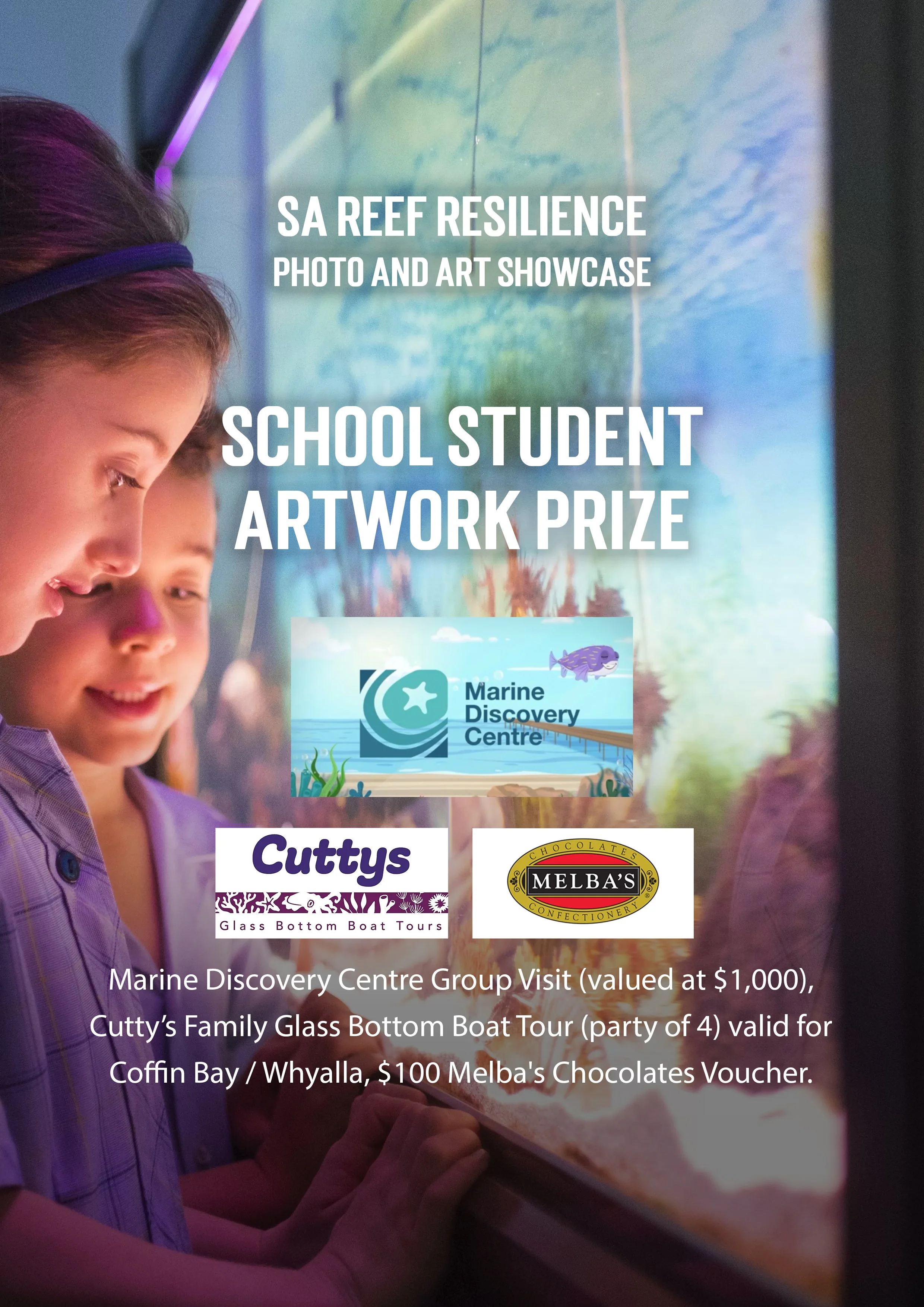 Open to South Australian school students in Years 3–9 (approximately ages 8–15). This category invites students to respond creatively to reef resilience, coastal life, and marine change through drawing, painting, collage, or mixed media. Entries may be submitted by individual students or as class-based artworks. -
