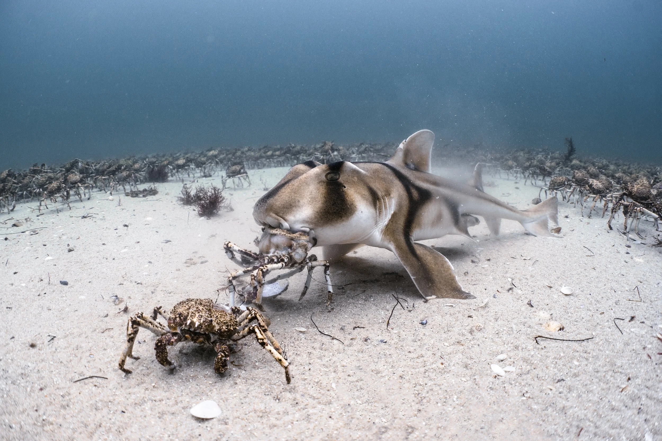 Scientists also want to know if the large gatherings of spider crabs help predators maintain healthy populations. Large stingrays, seals, seabirds and sometimes sharks can be spotted near the aggregation sites. The aim of the research goes beyond the spider crabs and hopes to answer questions about how crab aggregations affect the animals at the top of the food chain and what role it plays in the marine environment.