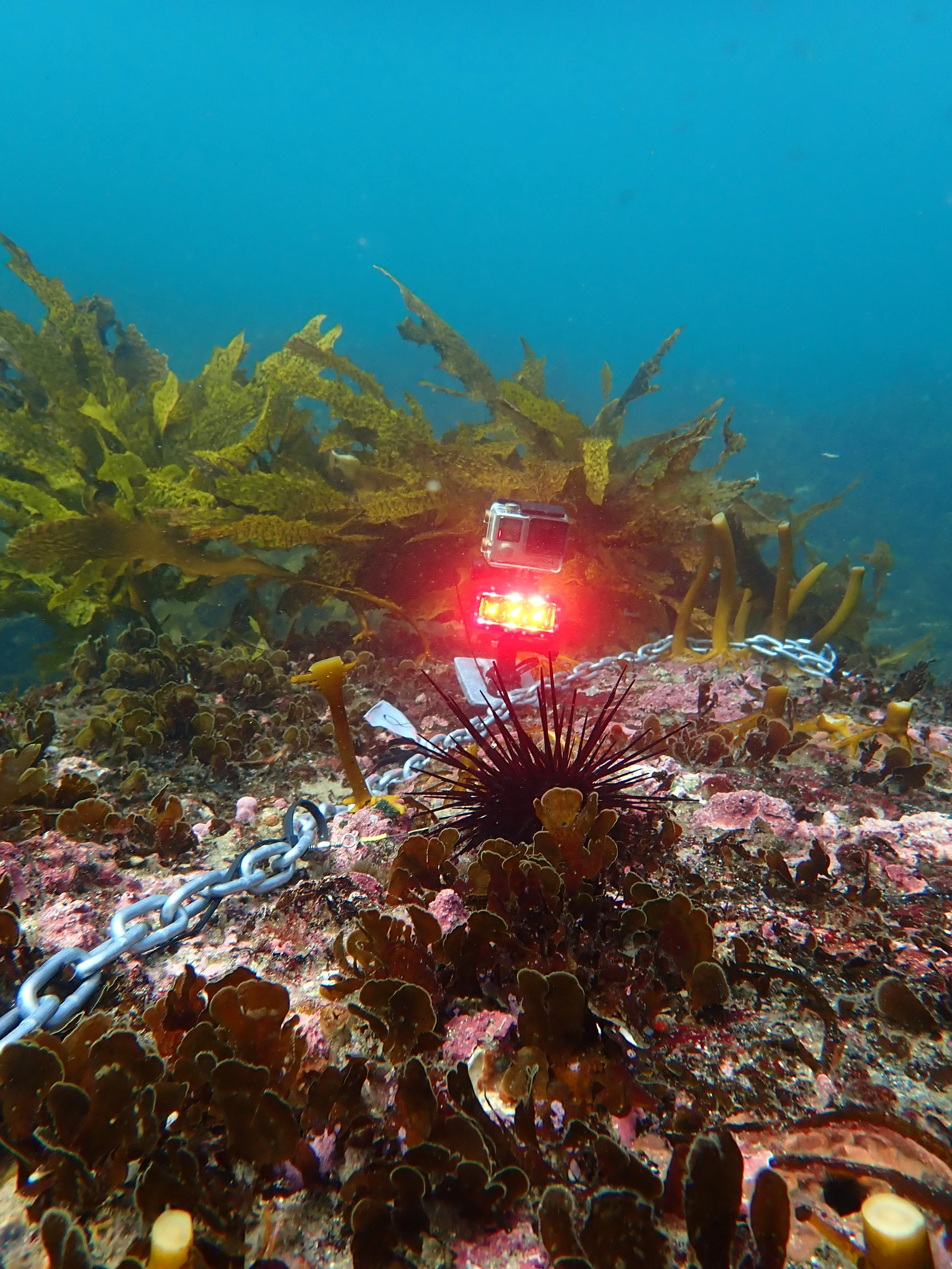 “It takes around three days from the lab to the field to set up these urchin arrays… carrying 24 cameras with weights, 13 chains, all the urchins, garden pegs - it was very heavy. We ferried the gear out on my old surfboard, then free-dived it down before setting up on scuba.”