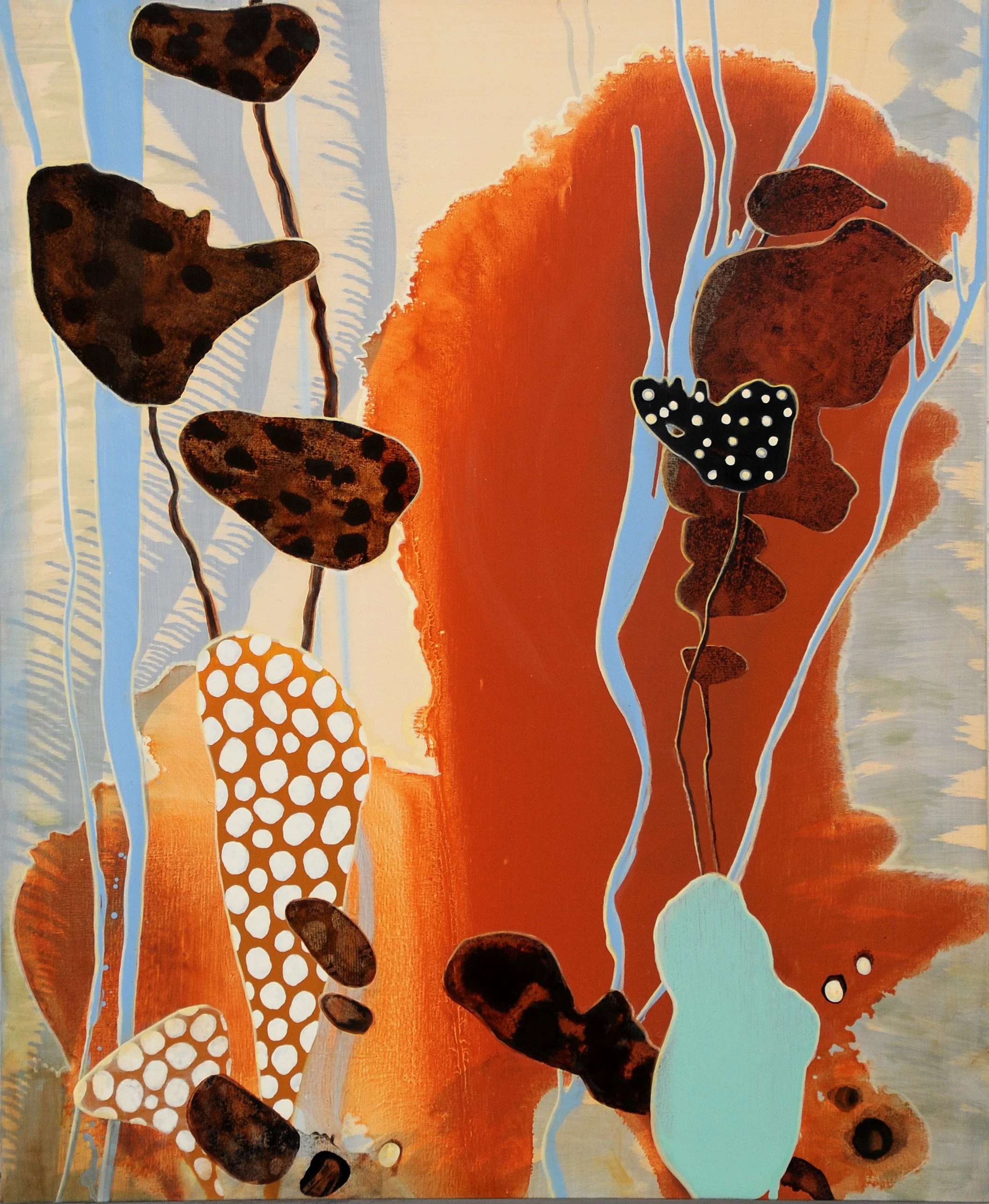 Fluidity and pouring: She uses highly liquid media (watercolours, diluted oils) and pouring techniques, tilting surfaces, letting pigments flow, to capture motion, the swaying of kelp, light through water.