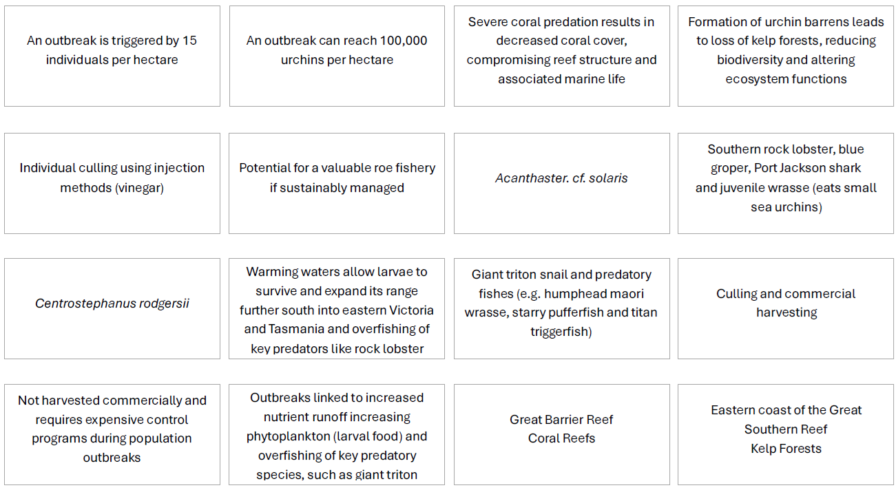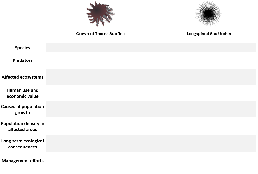 o Complete a comparative table for longspined sea urchins and Crown-of-Thorns starfish, accurately placing information about predators, ecosystems, population drivers, and management approaches.