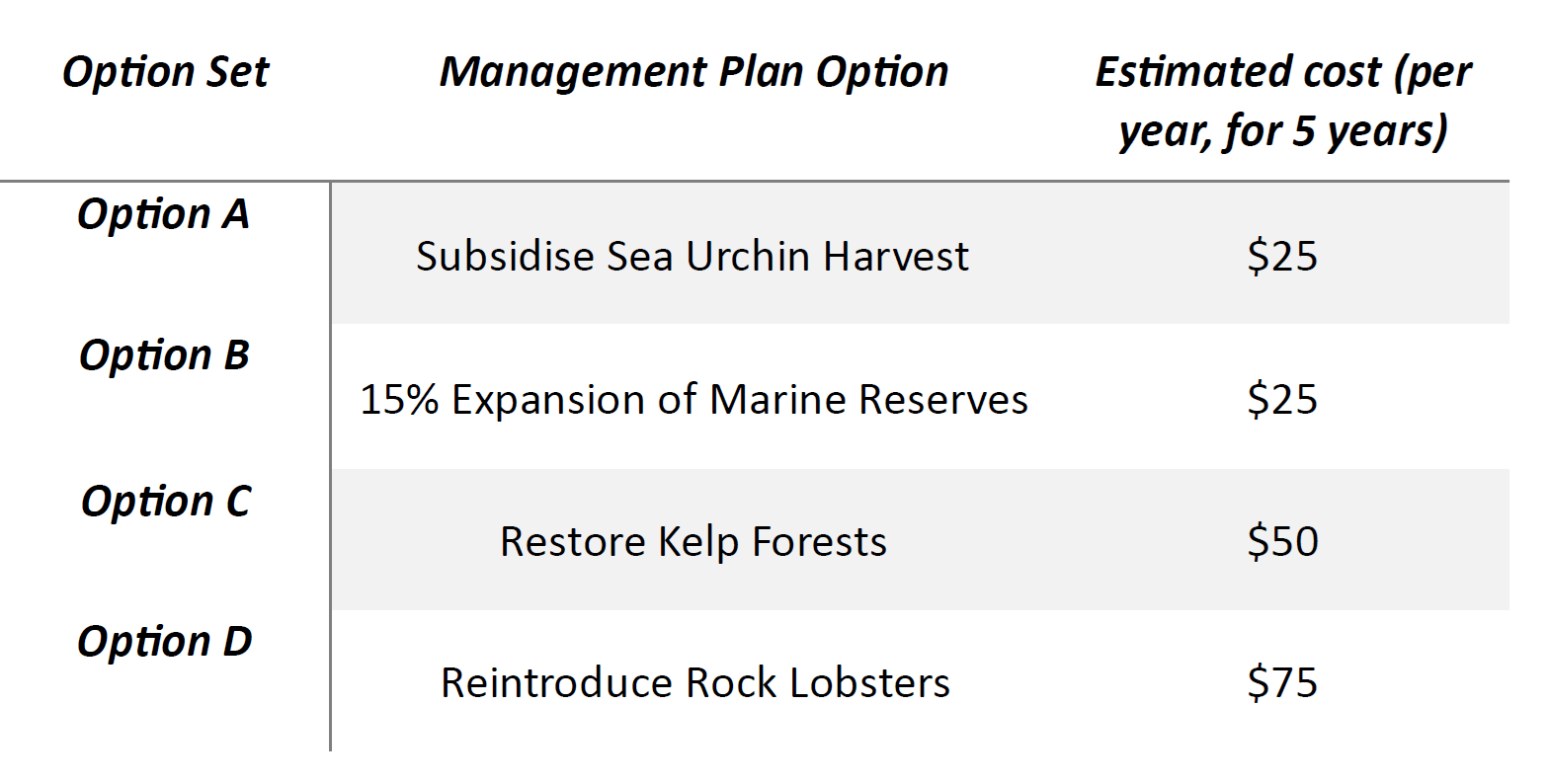 Note: This activity was developed based on and adapted from the study titled Investigating public preferences for the management of native and invasive species in the context of kelp restoration by Grover et al., 2021. While the restoration options, values, and information presented in this activity were inspired by the study, they have been modified for educational purposes and are not rigorously or directly linked to the original research.